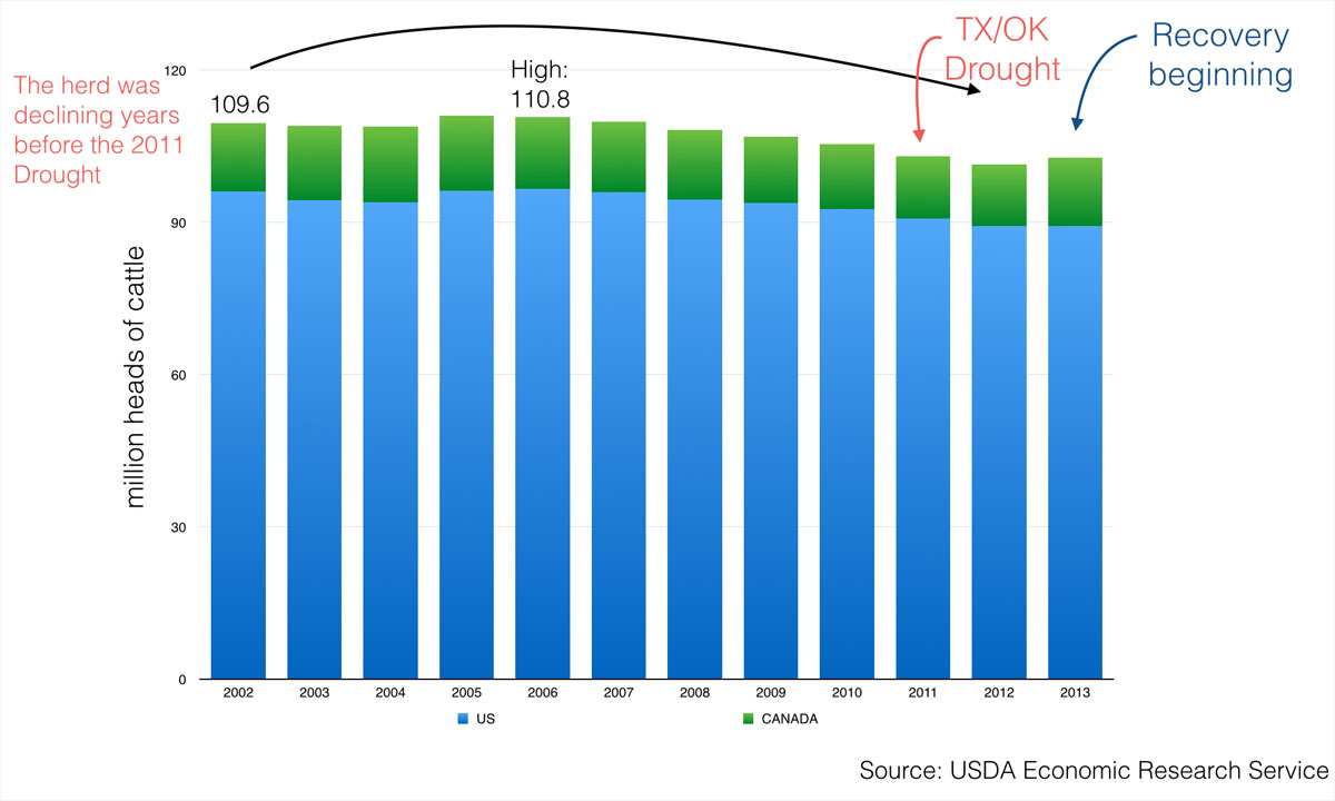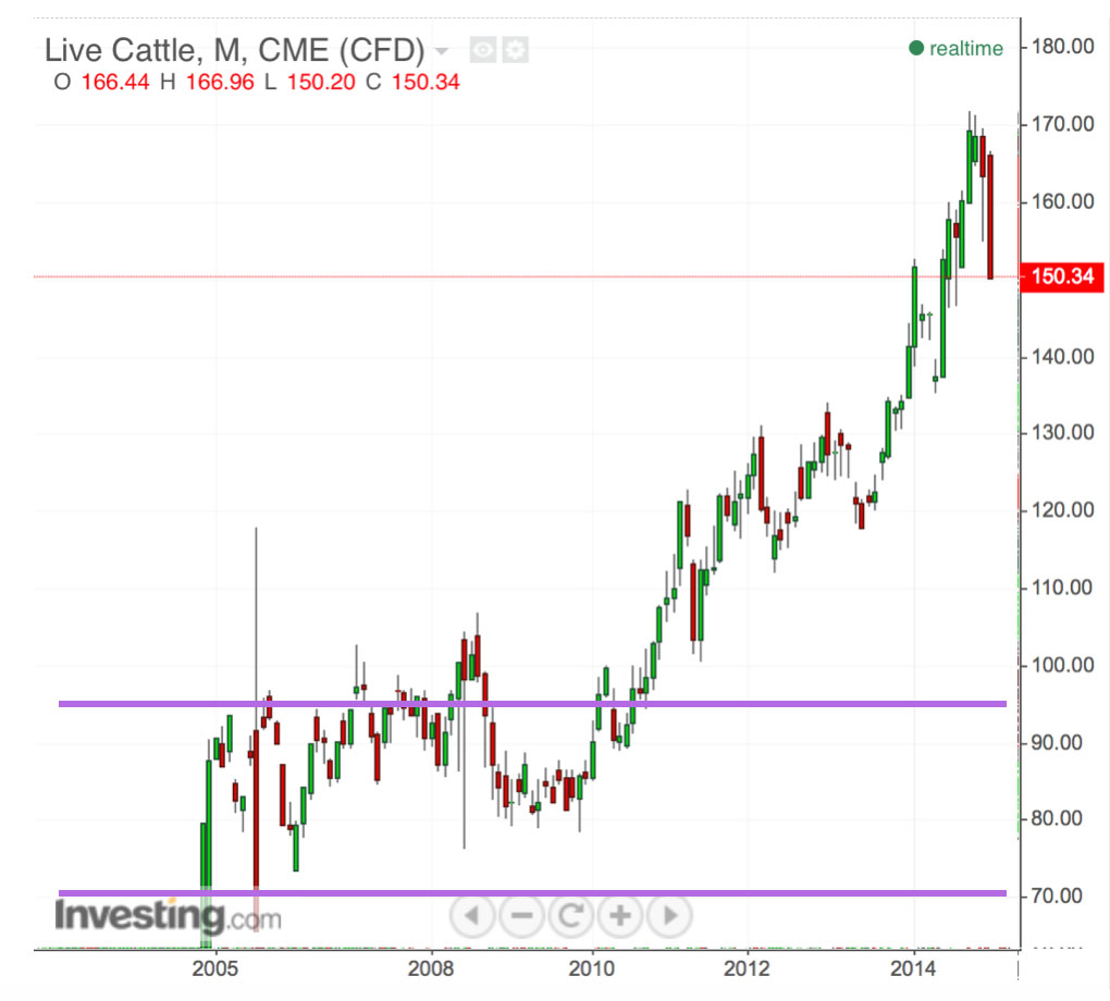 Other commodities rose in price because production growth was constrained by physical limitations imposed by the Earth. The US cattle herd actually declined over the past 12 years from culling.