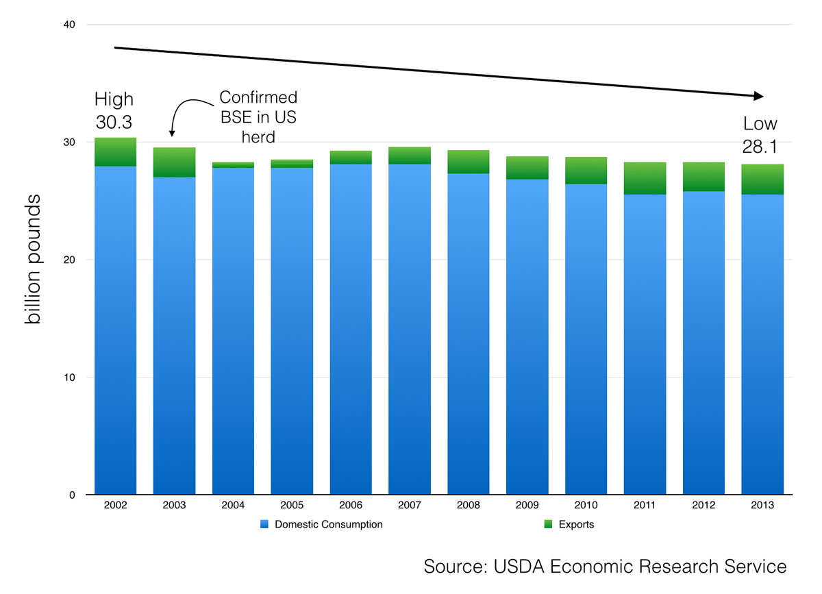 Domestic consumption of US beef has fallen while exports have risen. In aggregate, demand for US beef has fallen in the past 12 years.