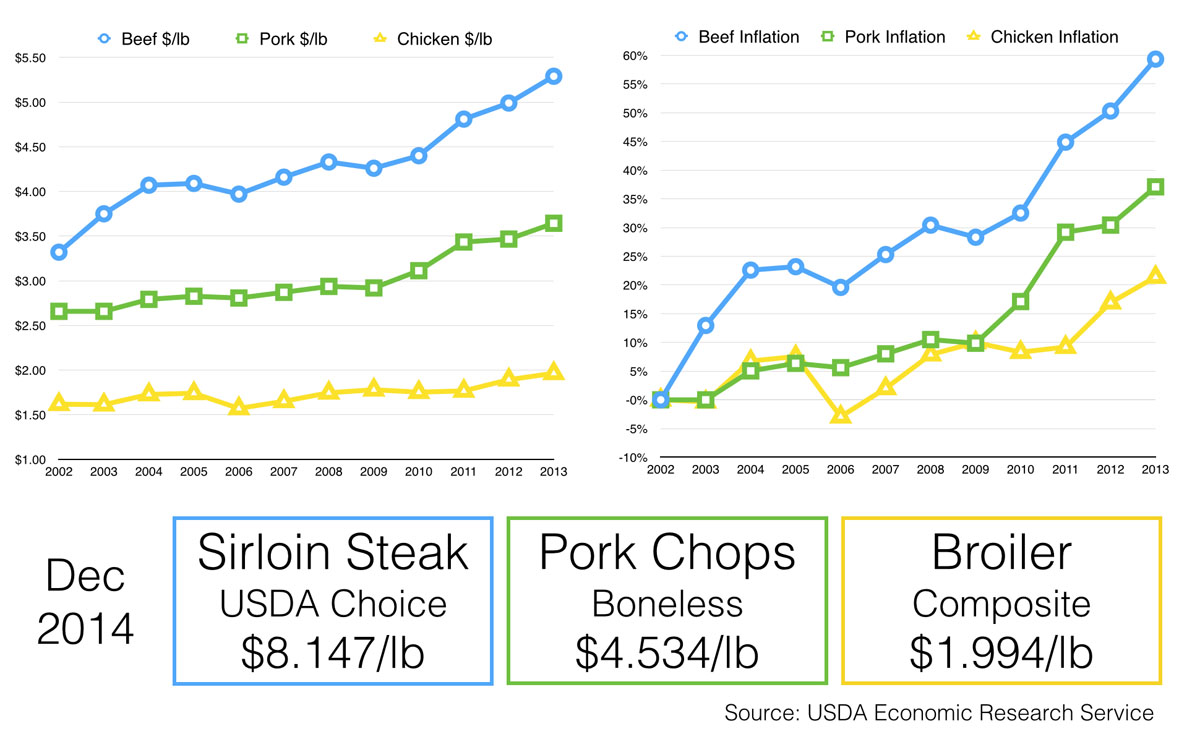Beef inflation has outpaced pork and chicken inflation over the past decade.