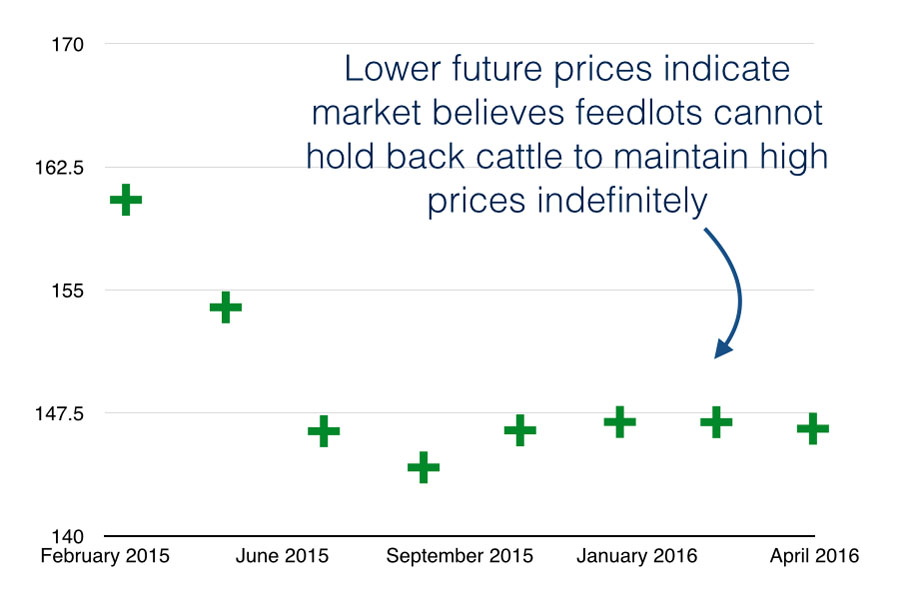 Live cattle prices in the future are lower than spot prices