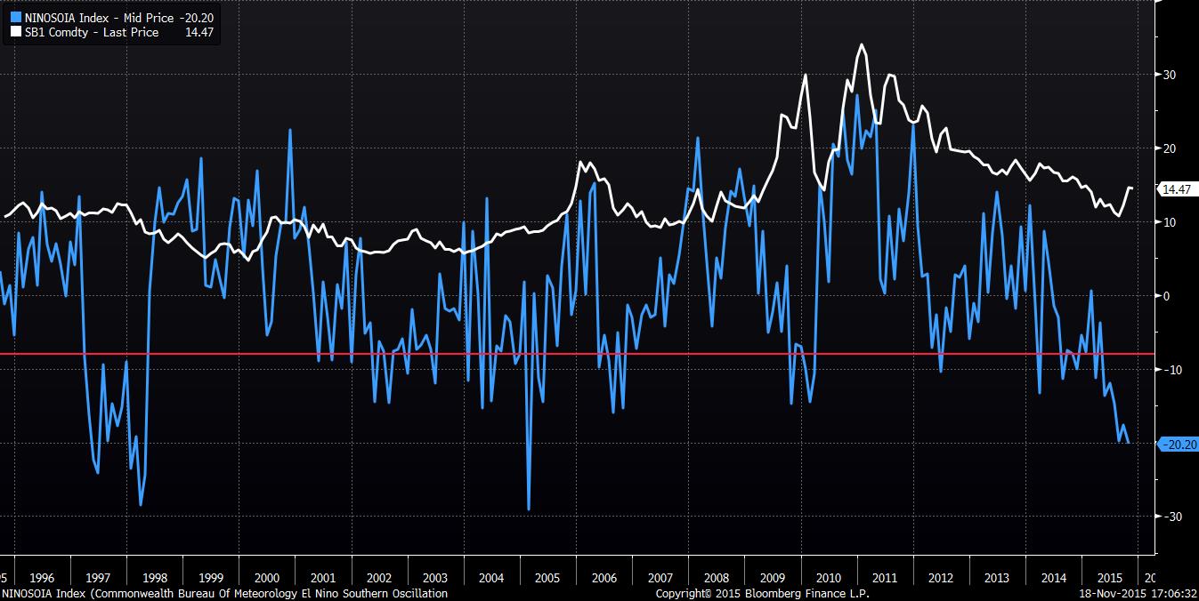 The main story fueling the bullish sugar trade is El Niño, a weather pattern that occurs every 2-7 years and lasts 9-12 months. The pattern causes stronger rain in Brazil, dryness in India, and typhoons in East Asia. Data indicates this El Niño will become the strongest on record (December-February is the peak timeframe for the phenomenon) and so the greatest potential damage has not yet happened.