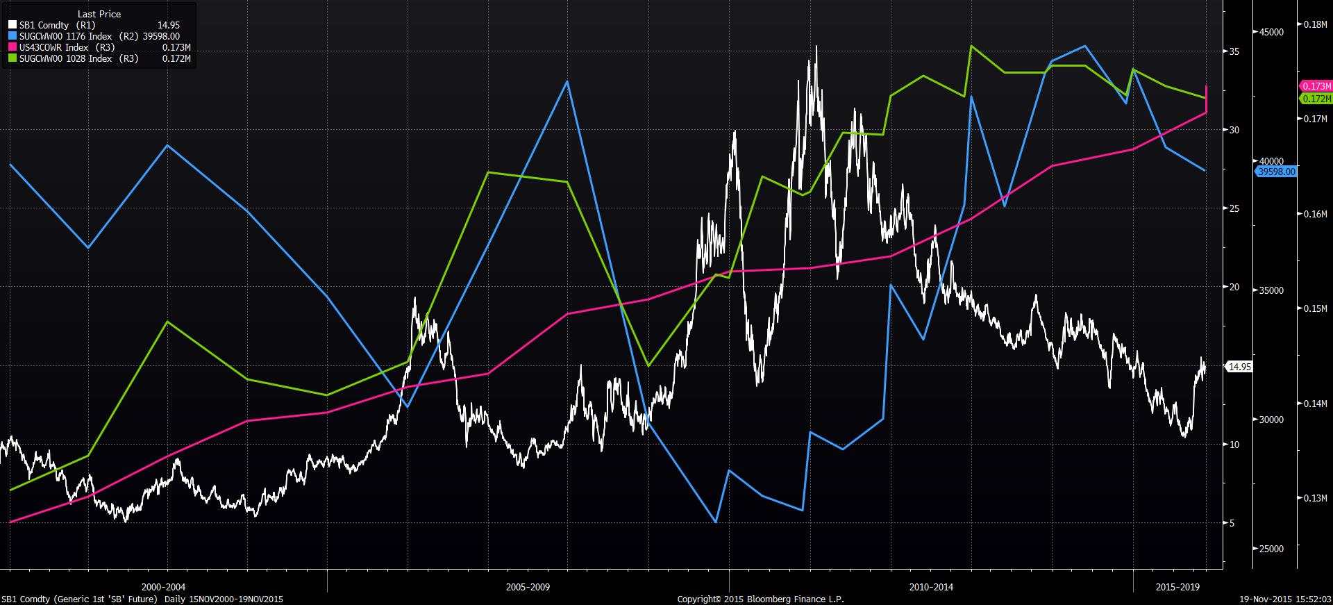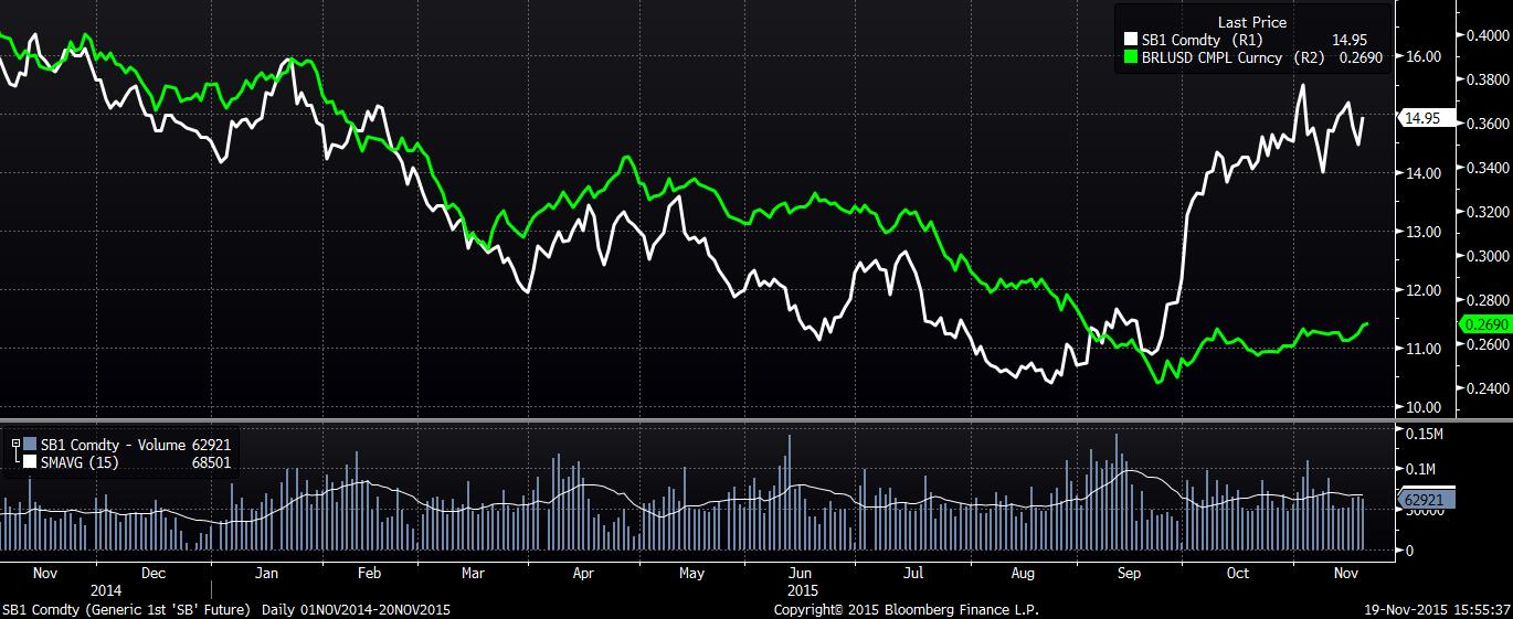 This relationship appears to have diverged beginning in September 2015. Sugar bottomed on August 24 at 11.51¢/lb (a 7-year low) and rose to 15.49¢/lb on November 3 while USD/BRL fell from 3.54 to 3.75 in the same period.