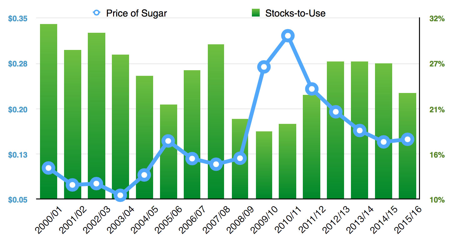 What has changed over the years is the size of the stockpile in relation to the size of consumption. Stocks-to-use ratio is an important metric to measure the sugar market. The USDA November 2015 forecast of stocks-to-use for 2015/16 is 22.9%. Stocks-to-use was 26.8% in 2012/13, 28.8% in 2007/08, and 30.2% in 2002/03. The ratio has tightened significantly compared to other time periods when global stockpiles were around 40 mmt.